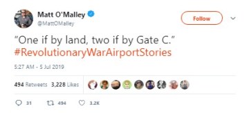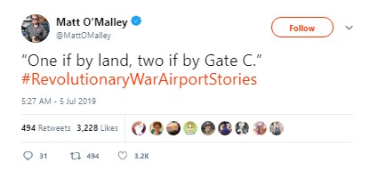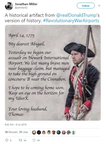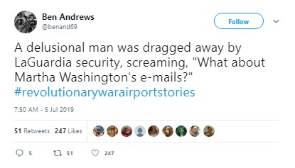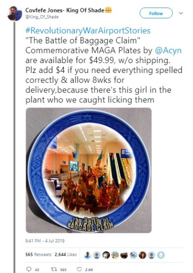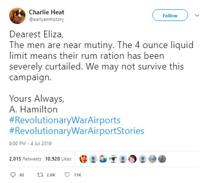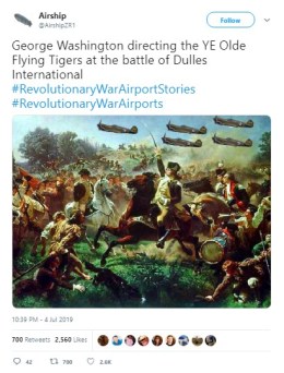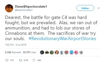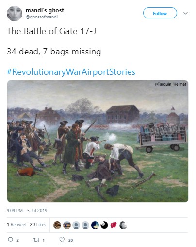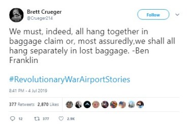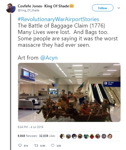 Before the fireworks had fizzled, people were weaving tales of the Battle of Baggage Claim (in which “Many lives were lost. And bags too,” per “Covfefe Jones, King of Shade”) and the like, using the hashtags #RevolutionaryWar Airports or #RevolutionaryWarAirportStories.