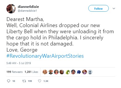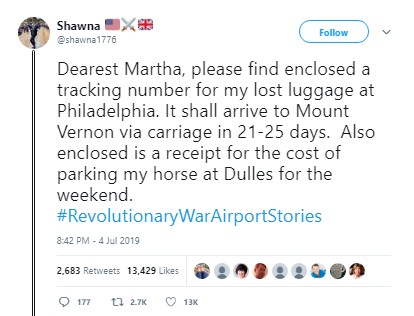Not to be outdone, General Washington, channeled by “Shawna,” tweeted: “Dearest Martha, please find enclosed a tracking number for my lost luggage at Philadelphia. It shall arrive to Mount Vernon via carriage in 21-25 days. Also enclosed is a receipt for the cost of parking my horse at Dulles for the weekend.”