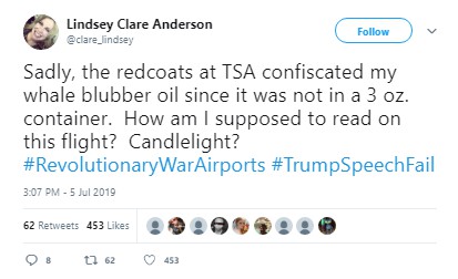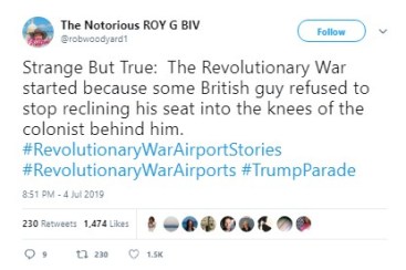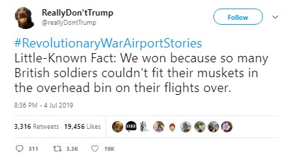 An account called “ReallyDon’tTrump” tweeted out: “Little- Known Fact: We won because so many British soldiers couldn’t fit their muskets in the overhead bin on their flights over.”