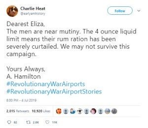 As with the Second Civil War tweets, some of my favorites were the letters home from those fighting the Redcoats. “JackWBower” wrote: “My Dearest Rose, I’m afraid I must be the bearer of bad news. My flight has already been delayed a fortnight, and I fear it will be longer. The army has shut down the airport and the airplane will not be invented for 6 score and 7 years from now.”
