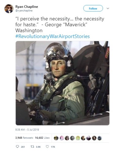 I mean, who knew George Washington was the original Top Gun Maverick? Sure seems that way according to Ryan Chapline’s tweet quoting the then-general as saying, “I perceive the necessity … the necessity for haste.”