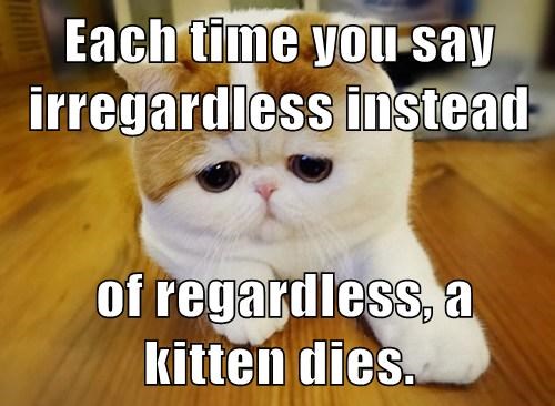 “Why not just use ‘nevertheless,’ ‘regardless,’ ‘still,’ ‘even so,’ or some similar wording,” he wrote, adding, “I have attorneys in court that say ‘irregardless.’ In fact, I have attorneys who do all the things I’m complaining about here. When a young person asks me what classes she should take to prepare for law school, I suggest English for obvious reasons, and math, because math teaches one to think logically.”