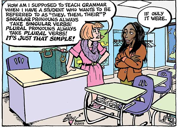 I have at least one friend (Hey, Cousin Earl!) who is a huge fan of the singular they, and commented on one of my columns a few years back, “Maybe there’s even hope for the ‘singular they.’ ‘Whenever a student told me they wanted a really good grade, I’d tell them they’d have to do the extra-credit assignments.’ ’Twould let our writin’ catch up with our speakin’.”