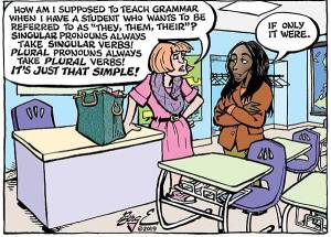 “I see absolutely no reason other than laziness to start subbing our hes and shes with a clunky they, or our hises and hers with theirs. There is a reason we have distinct pronouns, and that is so we can be specific. If we don’t know the specifics, we should try to find them out, or use one of those handy words — he or she or one, for instance — that get around the they problem. …