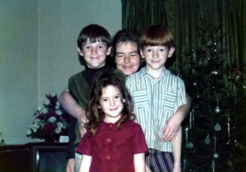 Probably the closest Mama ever got to helicopter parenting … and that’s a red cedar in the background, which was what most of our trees were (though we did use a tinsel tree a couple of years).
