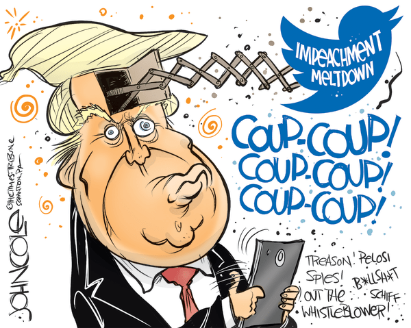 And no, despite what has been said recently regarding the Trump impeachment and what was said in 1998 to describe the Clinton impeachment, it is not a coup. The defining element of a coup, wrote PolitiFact in an October article, “is that it is carried out beyond the bounds of legality.” A 2013 report by the Coup D’etat Project at the University of Illinois’ Cline Center for Democracy, cited by PolitiFact, defines it as “the sudden and irregular (i.e., illegal or extra-legal) removal, or displacement, of the executive authority of an independent government.”