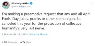Kimberly Atkins, a Washington reporter for WBUR Public Radio, issued a tweet Saturday that summed up the feelings of a lot of people while the pandemic is going on: “I’m making a pre-emptive request that any and all April Fools’ Day jokes, pranks or other shenanigans be canceled this year for the protection of collective humanity’s very last nerve.” As at least one Twitter user observed, but in a not-safe-for-family-newspaper way, there’s no prank that could match what’s going on right now.
