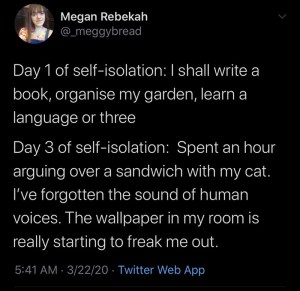 I never went out much to start, so this isn’t all that different, but I’ve realized that I do need human contact every once in a while. Whoda thunk?