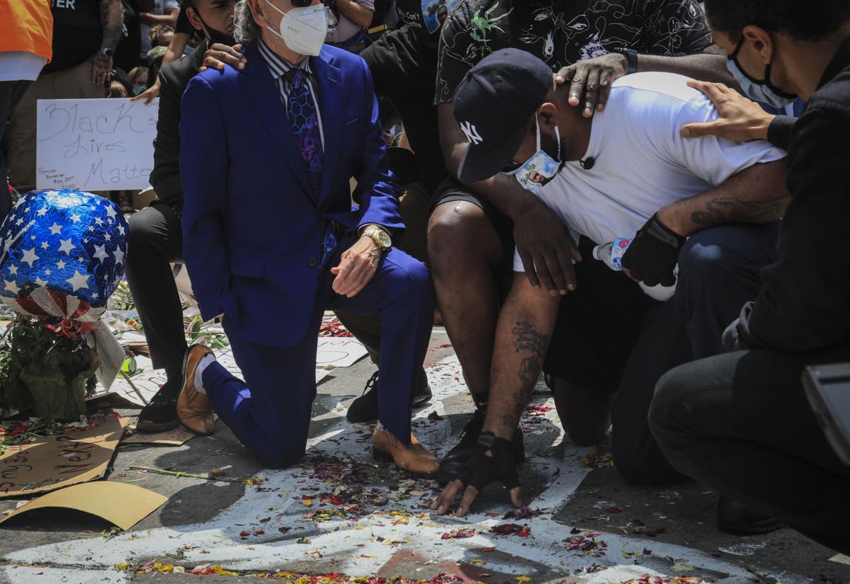 Terrence Floyd kneels at the memorial at the Minneapolis intersection where his brother died.