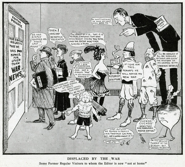 Complaints about stories not being covered aren’t new, as seen in this 1915 cartoon that imagines other news stories usually enjoyed by the press (child prodigies, enormous vegetables, the activities of militant suffragettes) being put to one side in favor of more topical war news.