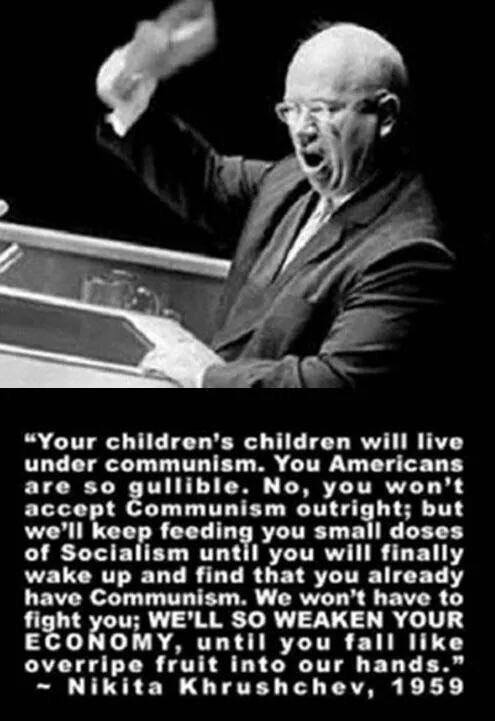 No, Nikita Khrushchev doesn’t appear to have said anything about feeding Americans “small doses of socialism” until they were living under communism without realizing it, or to have shared a list of eight levels of control to create a socialist state. According to the Reuters Fact Check team: “On Sept. 18, 1959, Khrushchev addressed the UN General Assembly. An unofficial transcript of this speech by The New York Times shows no evidence Khrushchev made the remarks attributed to him on social media. In the address, Khrushchev called for a gradual disarmament and an end to the Cold War. Nowhere does he outline a plan to introduce socialism to the U.S. by a piecemeal strategy.”