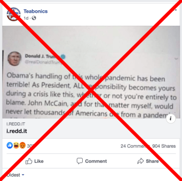 The ersatz tweet starts: “Obama’s handling of this whole pandemic has been terrible! As President, ALL responsibility becomes yours during a crisis like this, whether or not you’re entirely to blame.” While Trump has tweeted some things that didn’t age well (like that the electoral college was a disaster for democracy, or calling for a march on Washington after the “travesty” of the 2012 election), he didn’t tweet this, despite Facebook posts saying he did. FactCheck.org found no tweets in the Trump Twitter Archive matching that statement; he only tweeted 59 times in 2009 (that would be a relief now).