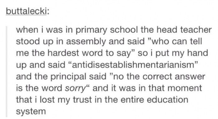 Joe O’Brien shared a word he really likes: “One mouthful I used in a grad school paper is antidisestablishmentarianism. I did not know then nor now the meaning, but it sounds so cool in a dense sense.”