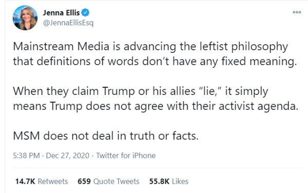 Take Jenna Ellis, attorney to the president (please, please take her). Over the weekend, she tweeted the accusation that the mainstream media (meaning apparently any media source that doesn’t fawn over the president) is using the word “lie” to perpetrate a leftist agenda in which “definitions of words don’t have any fixed meaning.”