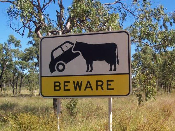 Well, that’s kinda cryptic. Beware: Cows will eat your car? No playing chicken with cows? Image found on AcidCow.