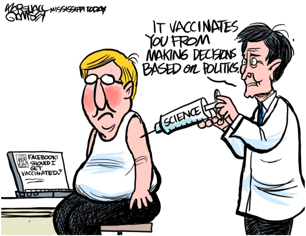 You should get the shot so we can get back to normal sooner, but if you refuse to get the vaccination, you should still do your civic duty to your fellow humans: Wear a mask when you can’t be socially distanced, and wash your hands. The longer you resist because of politics, the longer it will take for us to reach herd immunity, and the longer it will take for us to get out of this mess. As it is, because of all the stupidly stubborn people who refuse to do any of the above, many because of politics, I will be wearing my mask for the foreseeable future, and continuing to avoid some people.