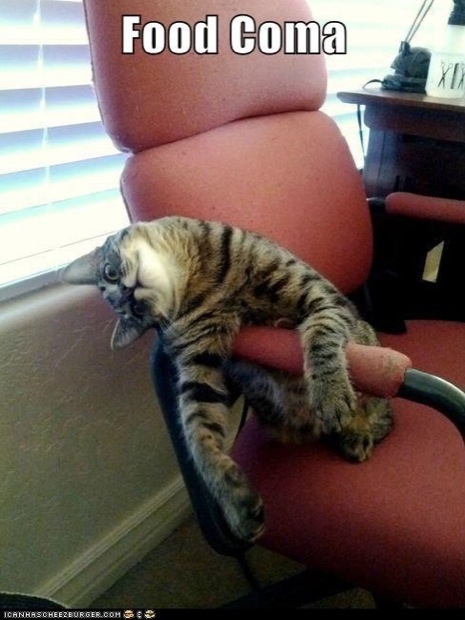Since I very rarely eat what normal people would call a full meal (for me, think about the size of a frozen food entree portion; I just can’t eat more than that usually), a food coma is inevitable for me at family dinners or meals at actual restaurants. Image found on iFunny.