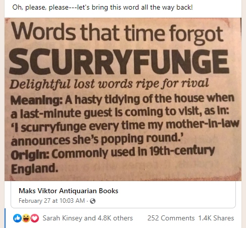 Scurryfunge deserves to be used more than it is. Language blogger Paul Anthony Jones, who blogs as Haggard Hawks, noted in an August 2017 post: “[W]hen it first appeared in the language in the late 18th century, scurryfunge originally meant ‘to beat’ or ‘lash,’ and later ‘to rub’ or ‘to scrub clean.’ These two apparently unrelated meanings are perhaps connected through allusion to someone working hard enough or with enough power or elbow-grease to wear away or abrade a surface; in that sense, etymologically scurryfunge may be in some way derived from scour. Precisely where the funge part comes from, however, is a mystery.”