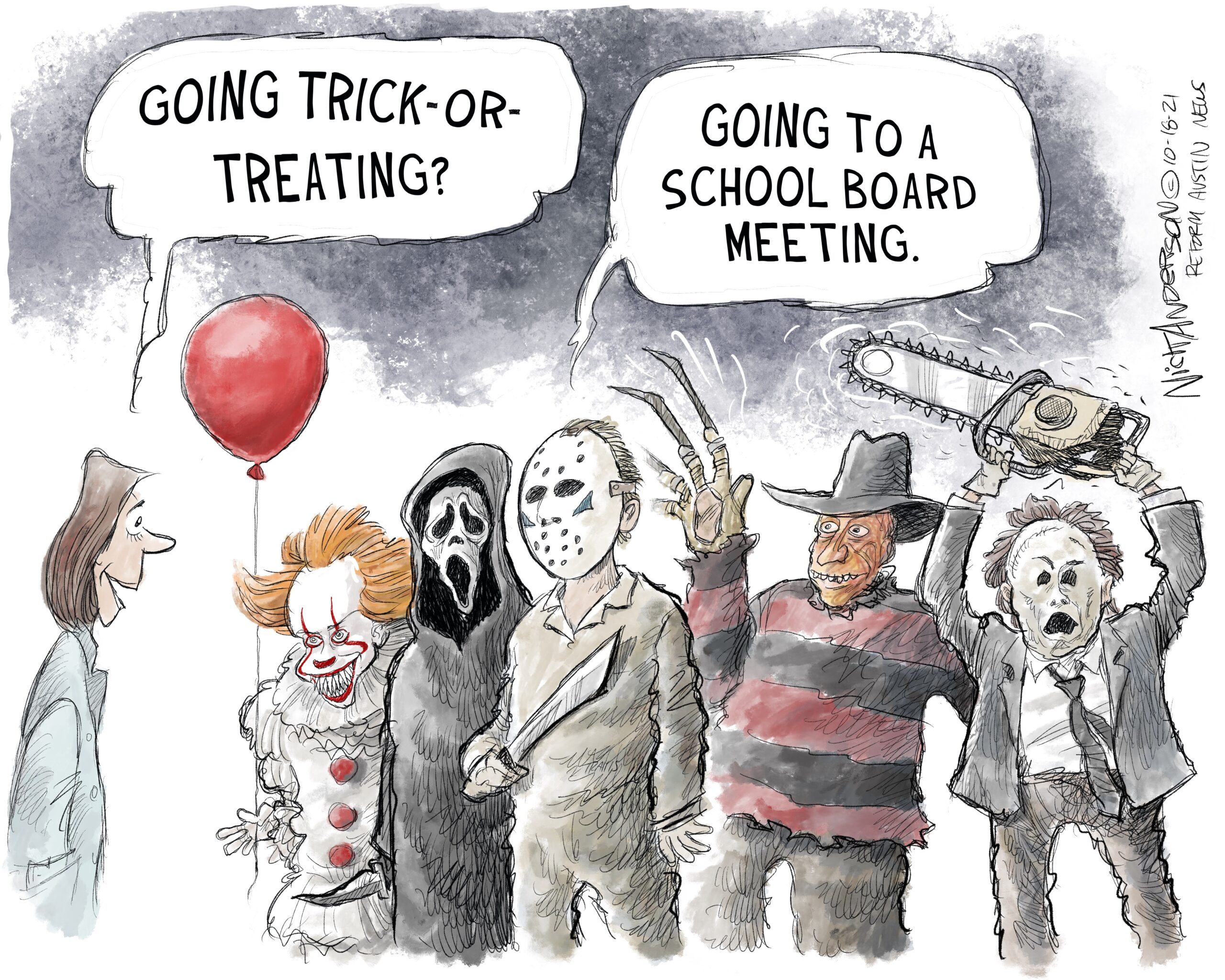 I think I’d rather see the fictional monsters at these meetings. Editorial cartoon by Nick Anderson, Reform Austin.