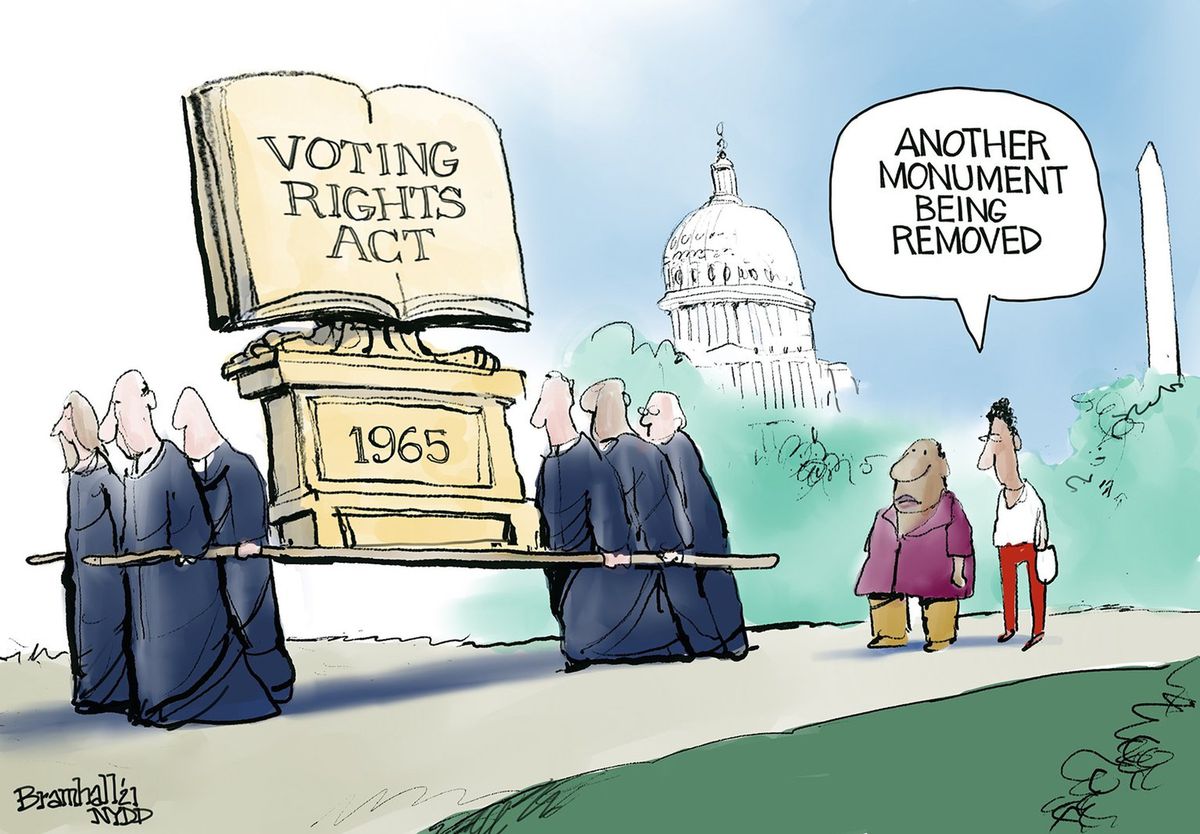 The Supreme Court gutting parts of the Voting Rights Act put us in the situation we’re in now where voting is concerned; it must be remedied if the right is to be protected. Editorial cartoon by Bill Bramhall, New York Daily News.