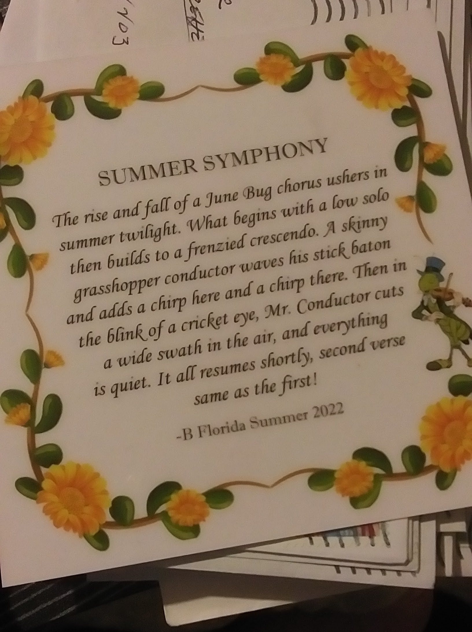 It was a lovely bit of prose she wrote called “Summer Symphony” on a laminated card with a magnet: