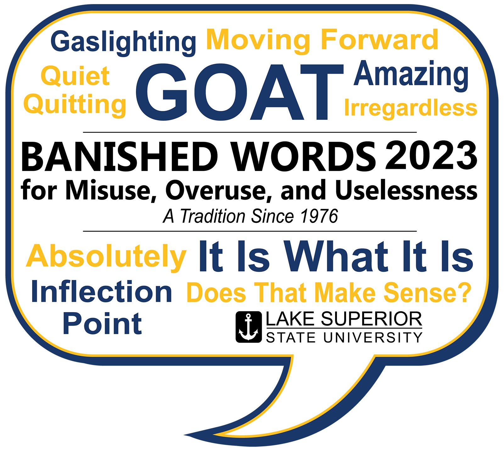 “Language monitors across the country and around the world decried the decrepitude and futility of basic methods to impart information in their mock-serious entries for Lake Superior State University’s annual tongue-in-cheek Banished Words List. LSSU announces the results of the yearly compendium on Dec. 31 to start the New Year on the right foot, er, tongue. The vast majority of the 1,500-plus nominations of words and terms for banishment for misuse, overuse, and uselessness for 2023 reveled and wallowed in the erosion of fundamental expression.”