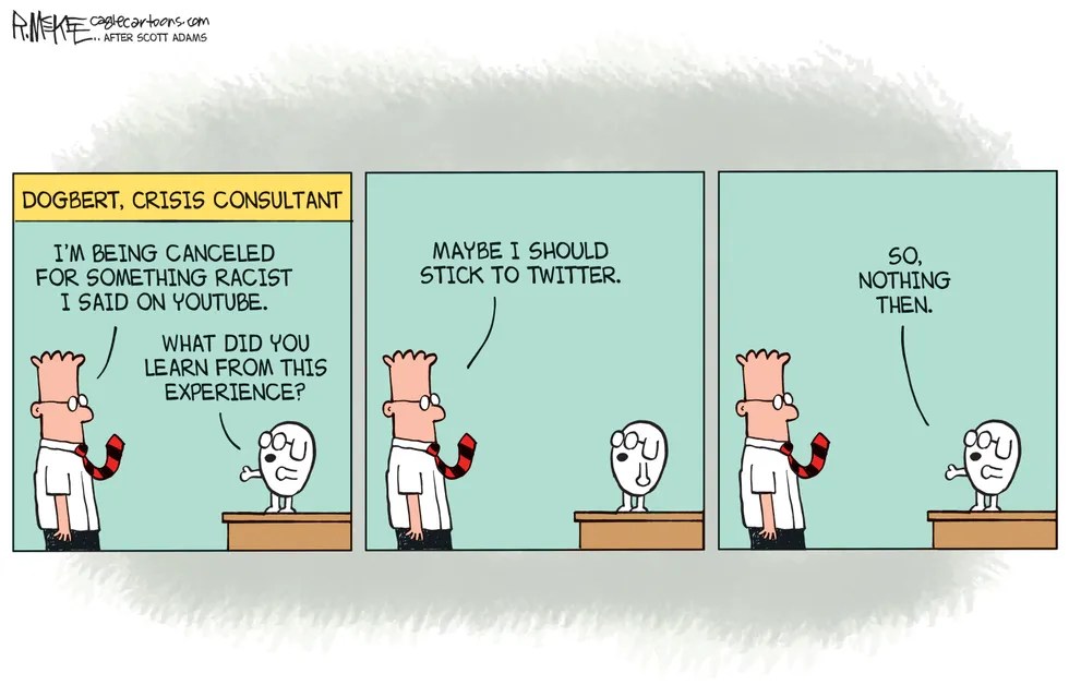 Tom Jones of Poynter asked, “Was Adams a victim of cancel culture? Actually, I would suggest this is consequence culture. That is, if you say or do something stupid or, in this case, incredibly racist and harmful and divisive, you suffer the consequences. The consequence here is newspapers dropping the comic strip. …