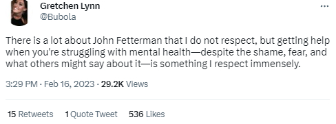 It would have been nice if more of Fetterman’s detractors had been like Gretchen Lynn, who tweeted, “There is a lot about John Fetterman that I do not respect, but getting help when you’re struggling with mental health—despite the shame, fear, and what others might say about it—is something I respect immensely.”