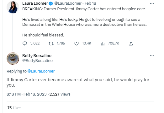 To which Betty Borsalino replied: “If Jimmy Carter ever became aware of what you said, he would pray for you.”