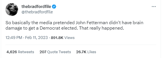 The Bradford File tweeted, “So basically the media pretended John Fetterman didn’t have brain damage to get a Democrat elected. That really happened.”