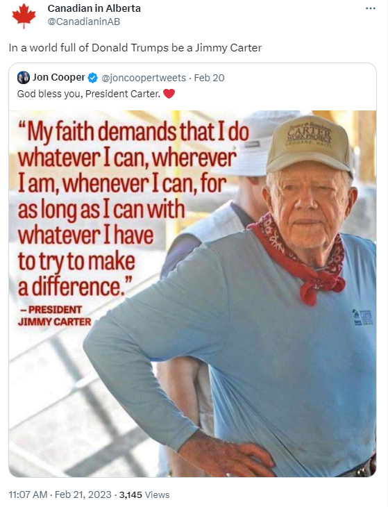 True. In the more than 40 years since he left office, Carter has proved to be a true humanitarian and Christian, someone who makes a lot of us happy to be an American, no matter where we sit on the political spectrum.