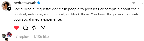 Users ultimately direct where a platform goes, and on Threads, there has been more of an effort to steer toward the social contract that until the last few decades kept us from acting like selfish jerks whose mamas didn’t raise them right. If you’re using social media for an adrenaline rush or to abuse and to delight in the abuse of other people, Twitter is probably more your speed.