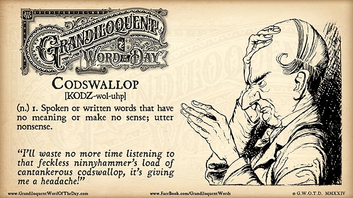 The example sentence, as usual, is a delight: “I’ll waste no more time listening to that feckless ninnyhammer’s load of cantankerous codswallop, it’s giving me a headache!”