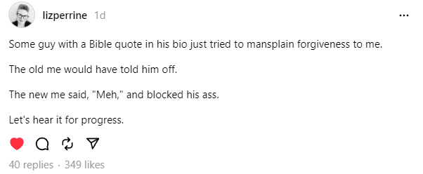 Sometimes you have to just block for your peace of mind because life’s too short to deal with people who only want to harass you for “lolz.” Screenshot from Liz Perrine’s Threads account.
