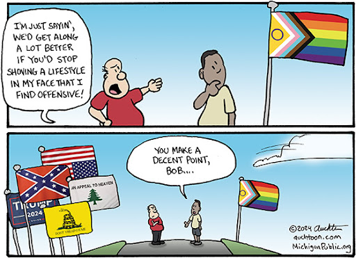 We’re offended by the mere existence of people who don’t believe or live as we do, claiming that by their insistence they be allowed to live as openly as anyone else that they’re throwing it in our faces. I mean, seriously, how dare they!