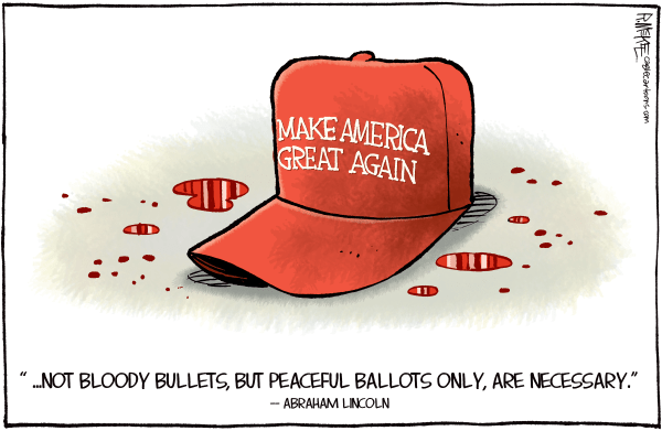 Molly Ball of The Wall Street Journal wrote Sunday: “In an instant, it seemed, everything had changed—a nasty, all-consuming political season suddenly pulled up short and confronted with the harrowing mortal core beneath the abstract debates over the nation’s future. The campaign couldn’t go on as before. No longer could the dehumanizing rhetoric, the apocalyptic warnings continue; something had to give.