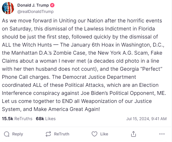 It didn’t take long for him to return to form. This is the sort of thinking that gets people believing everything is “us versus them,” and calls of condolence from the current president don’t get accepted by the widow of Corey Comperatore because her husband was a “devout Republican” who wouldn’t want her to speak to him. Screenshot from Truth Social.