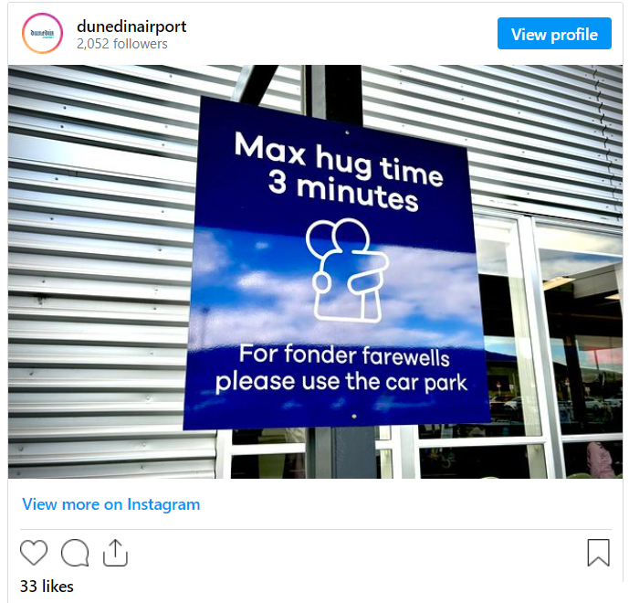 🫂 An airport in New Zealand is getting attention for a new sign in the dropoff area urging passengers and their drivers to limit farewell hugs to three minutes, according to UPI (they recommend the car park for longer goodbyes). Dan De Bono, Dunedin Airport’s chief executive, told reporters that some goodbyes have been taking too much time. “We’re trying to have fun with it. It is an airport and those dropoff locations are common locations for farewells. There’s no space left for others. It’s about enabling others to have hugs.”