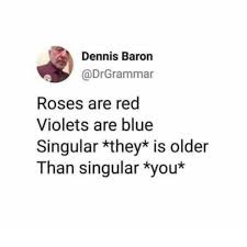 Baron wrote, “Former Chief Editor of the OED Robert Burchfield, in The New Fowler’s Dictionary of Modern English Usage (1996), dismisses objections to singular they as unsupported by the historical record. Burchfield observes that the construction is ‘passing unnoticed’ by speakers of standard English as well as by copy editors, and he concludes that this trend is ‘irreversible,’ People who want to be inclusive, or respectful of other people’s preferences, use singular they. And people who don’t want to be inclusive, or who don’t respect other people’s pronoun choices, use singular they as well.”