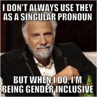 But not everyone approved, including the Chicago Manual of Style … and an awful lot of people who tend to get bees in their bonnets, such as the Tennessee legislature in 2015, which tried to forbid the use of taxpayer dollars for gender-neutral pronouns. (How would that even be accomplished? In that particular instance, they tied it to funding for diversity programming at the University of Tennessee. They’re still at the whole pronoun thing, by the way. Someone should maybe check on them to see if they’re OK.)