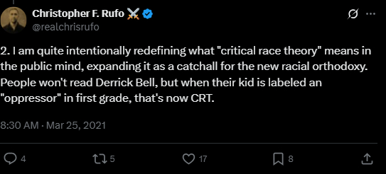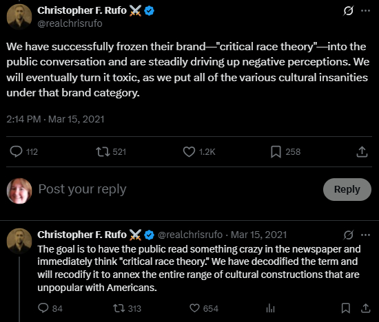 Rufo, though, so broadened the topic that basically anything he doesn’t like qualifies, crowing on X/Twitter in March 2021, “We have successfully frozen their brand—‘critical race theory’—into the public conversation and are steadily driving up negative perceptions. We will eventually turn it toxic, as we put all of the various cultural insanities under that brand category. The goal is to have the public read something crazy in the newspaper and immediately think ‘critical race theory.’ We have decodified the term and will recodify it to annex the entire range of cultural constructions that are unpopular with Americans.”