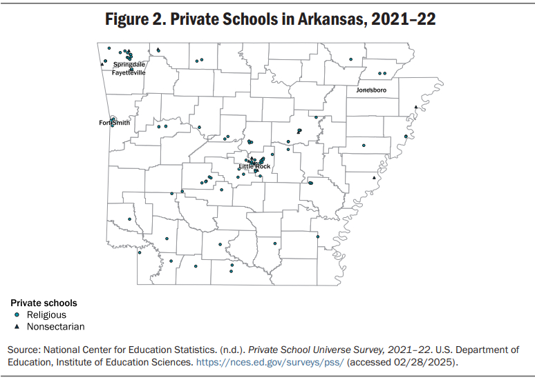 That hasn’t really changed. A report from the Learning Policy Institute (a nonpartisan, nonprofit educational policy research group) in March found that there are 1,084 public schools in Arkansas (about 250 school districts), and an estimated 149 private schools, only 26 of which are nonsectarian (as some parents believe they, not schools, are responsible for their children’s religious instruction, as they should be, in my humble opinion; unless it’s comparative religion study, theology of any kind doesn’t belong in public schools). Of those private schools, 72.8 percent are in urban or suburban areas.