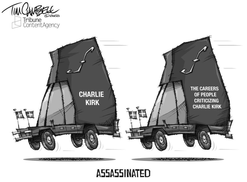 Some of those people were probably just repeating the words Kirk said. Maybe I’ll be next to have to pay the cost of holding someone responsible for their own words. Editorial cartoon by Tim Campbell.
