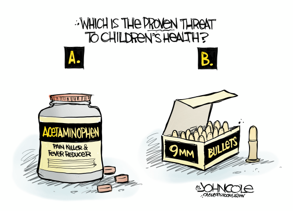 I really wish people in positions of power spoke more harshly of guns and ammo than Tylenol. Editorial cartoon by John Cole.