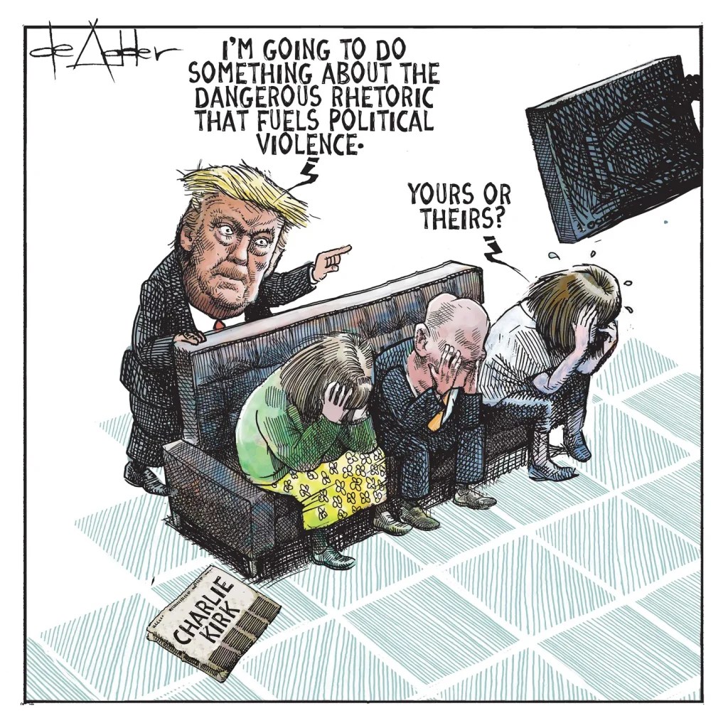 Some of those people were probably just repeating the words Kirk said. Maybe I’ll be next to have to pay the cost of holding someone responsible for their own words. Editorial cartoon by Tim Campbell.
