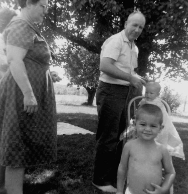 Grandpa used to give my brothers haircuts so they’d just have fuzz (just like him). Mitch (in front) already had his, and Kevin’s in the chair.