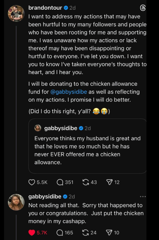 Some of the funniest bits from the whole affair have been the posts by Gabby Sidibe and her husband Brandon Frankel. Gabby posted, “Everyone thinks my husband is great and that he loves me so much but he has never EVER offered me a chicken allowance.” Brandon relented in a long and sweet post, to which Gabby replied, “Not reading all that. Sorry that happened to you or congratulations. Just put the chicken money in my cashapp.”