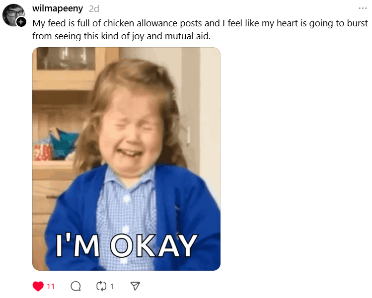 Wilma Peeny summed the whole thing up so well with, “My feed is full of chicken allowance posts and I feel like my heart is going to burst from seeing this kind of joy and mutual aid.”