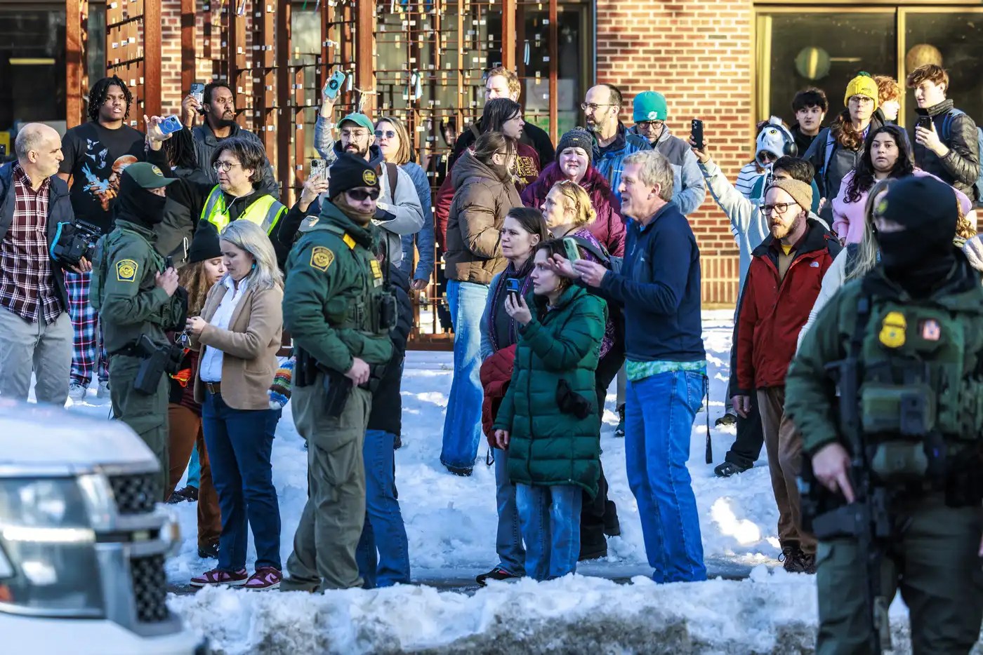 Federal agents in Minneapolis are met by protesters at a school around dismissal time. Image by Kerem Yücel/MPR News found on Minnesota Public Radio.