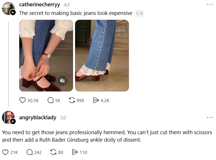Ankle doilies? Supposedly “the secret to making basic jeans look expensive,” which made Imani Gandy reply, “You need to get those jeans professionally hemmed. You can’t just cut them with scissors and then add a Ruth Bader Ginsburg ankle doily of dissent.” (The comments on the original are hilarious!)